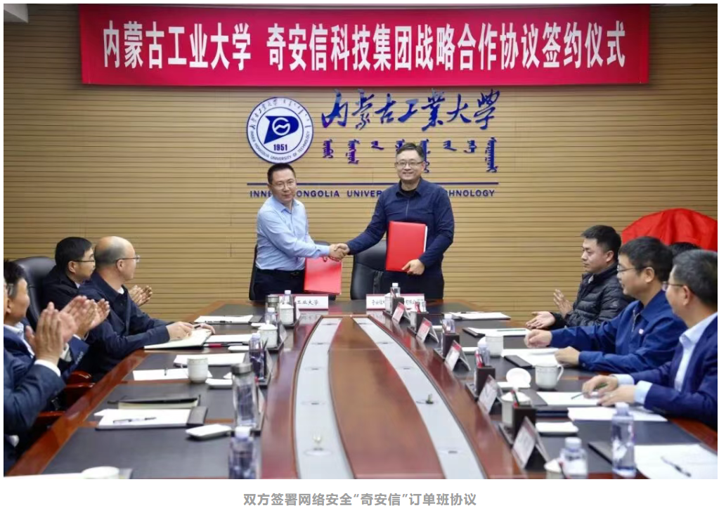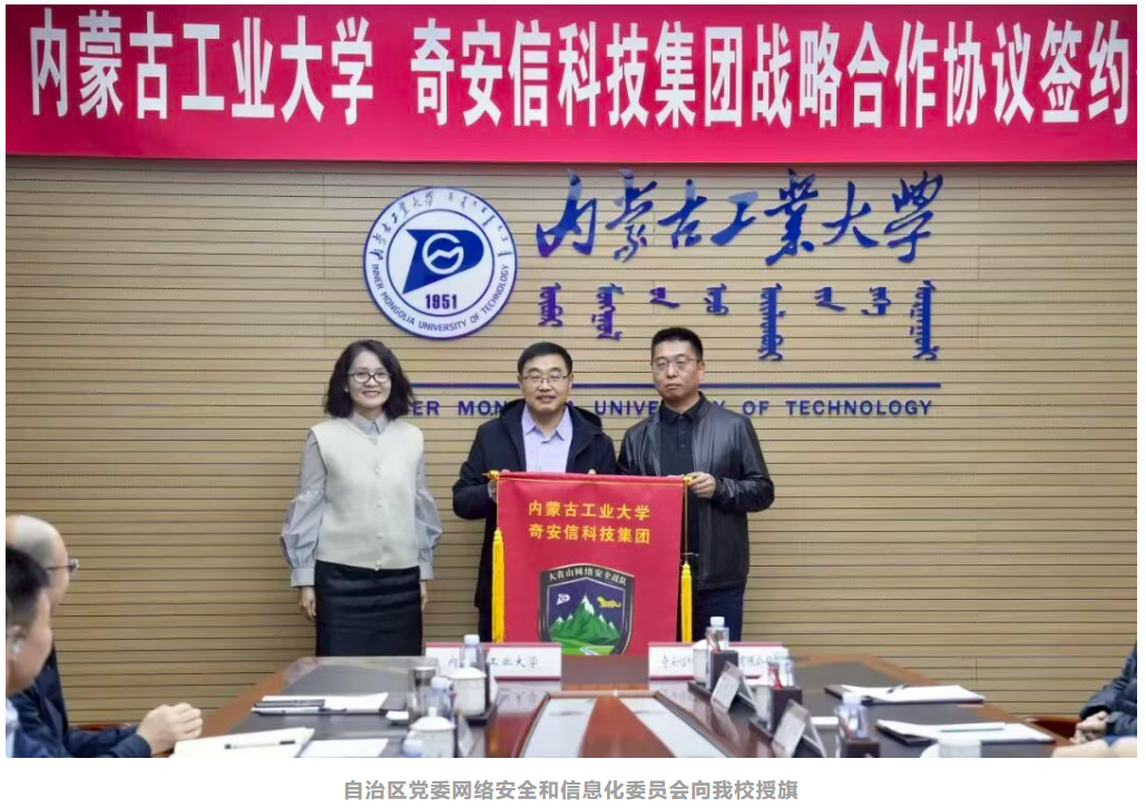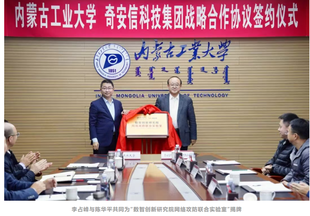会上,李占峰与陈华平共同为“数智创新研究院网络攻防联合实验室”揭牌。刘利强与奇安信科技集团内蒙古分公司总经理杨召代表双方签署产学研用一体化合作协议。智能科学与技术学院(网络空间安全学院)副院长马志强与奇安信科技集团战略部主任乔思远签署网络安全“奇安信”订单班协议。自治区党委网络安全和信息化委员会办公室网络安全处副处长南丁为大青山网络安全战队领队、智能科学与技术学院(网络空间安全学院)院长王钢授旗。