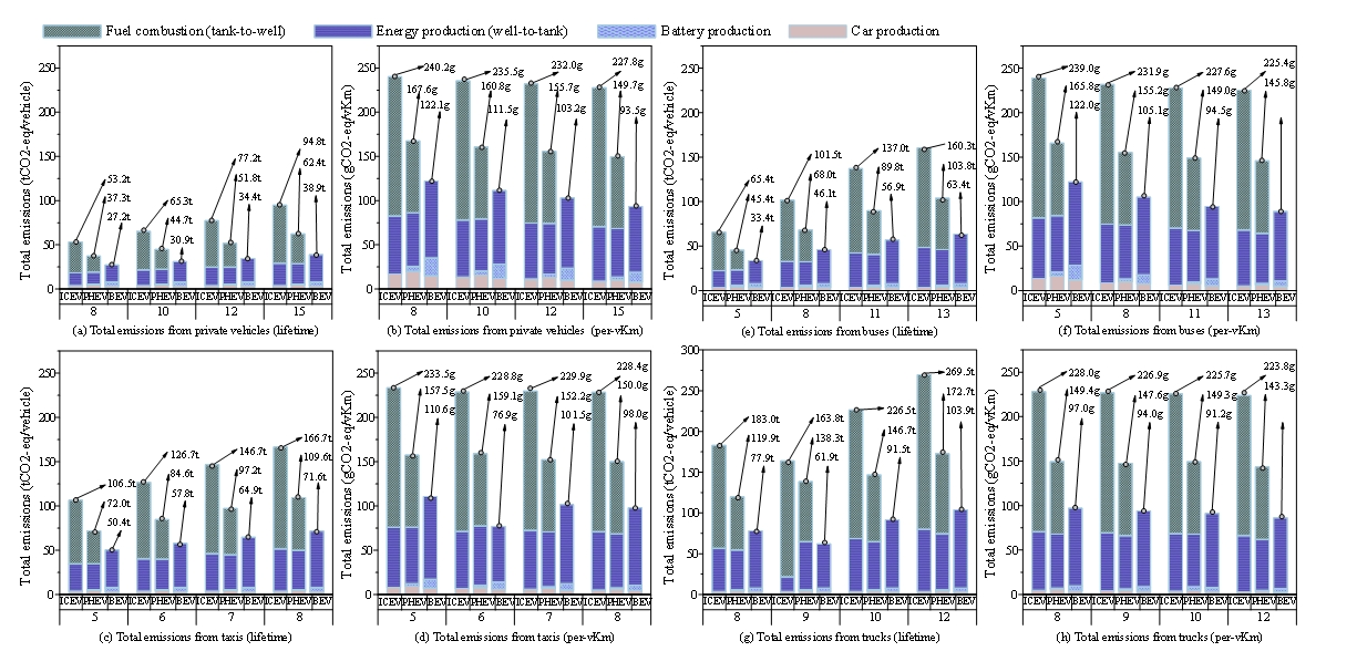2. 不同类型和动力来源的车辆在其生命周期的多个阶段的总碳排放量