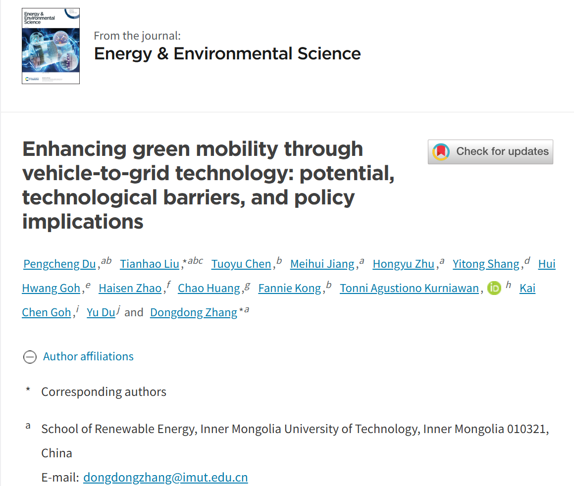 该研究成果受到国家自然科学基金(52107083、52307072、62372039));广西重大科技专项(AA22068071);“科创甬江2035”关键技术突破计划项目双碳科技专项(2024Z250))等项目支持。相关研究文章“Enhancing green mobility through vehicle-to-grid technology: potential, technological barriers, and policy implications”(DOI: https://doi.org/10.1039/D5EE00116A)在国际能源领域顶刊《Energy & Environmental Science》(中国科学院一区TOP,IF:32.4)发表,并入选期刊封面论文(入选率5%左右)。开云张冬冬教授为论文通讯作者,张冬冬教授所指导的博士生杜鹏程为第一作者,开云为论文第一单位和通讯单位。(文章链接https://pubs.rsc.org/en/Content/ArticleLanding/2025/EE/D5EE00116A)