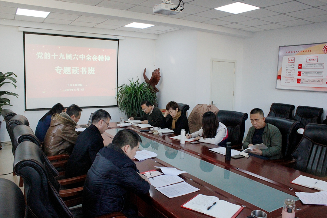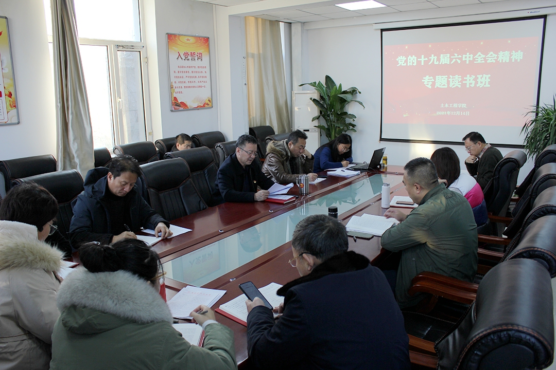 12月14日上午,土木工程学院举办学习贯彻党的十九届六中全会精神专题读书班。学院领导班子成员、党委委员、科级干部、支部书记共计23人参加。党委书记那音巴雅尔主持读书班。