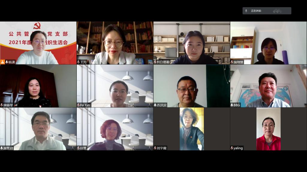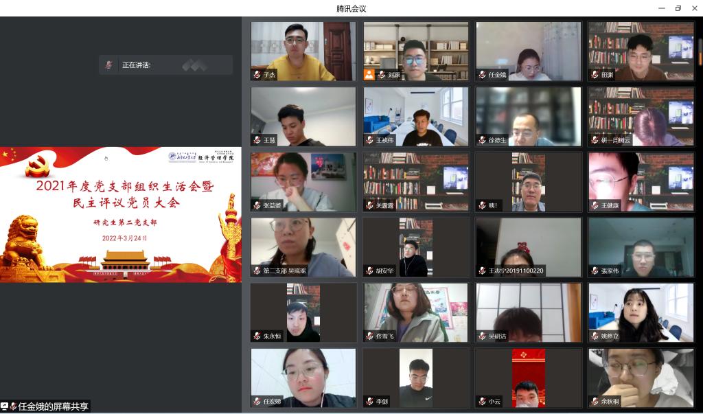 按照学校党委《关于召开2021年度党支部组织生活会和开展民主评议党员的通知》要求,经济管理学院党委高度重视,于3月19日召开了线上党建工作会,对组织生活会进行了动员部署,并对党支部书记进行专题培训,要求严格执行疫情期间各项规定,全体教师居家办公,做好个人防护,保障教学科研工作。经过动员和培训,12个党支部协调时间分别在3月22日至25日之间有序组织召开线上2021年度组织生活会和开展民主评议党员。各党支部组织支部成员进行了自查、批评和自我批评,查找不足和问题,并对新学期工作提出了改进方向和整改措施。领导班子成员以普通党员身份参加所在支部组织生活。