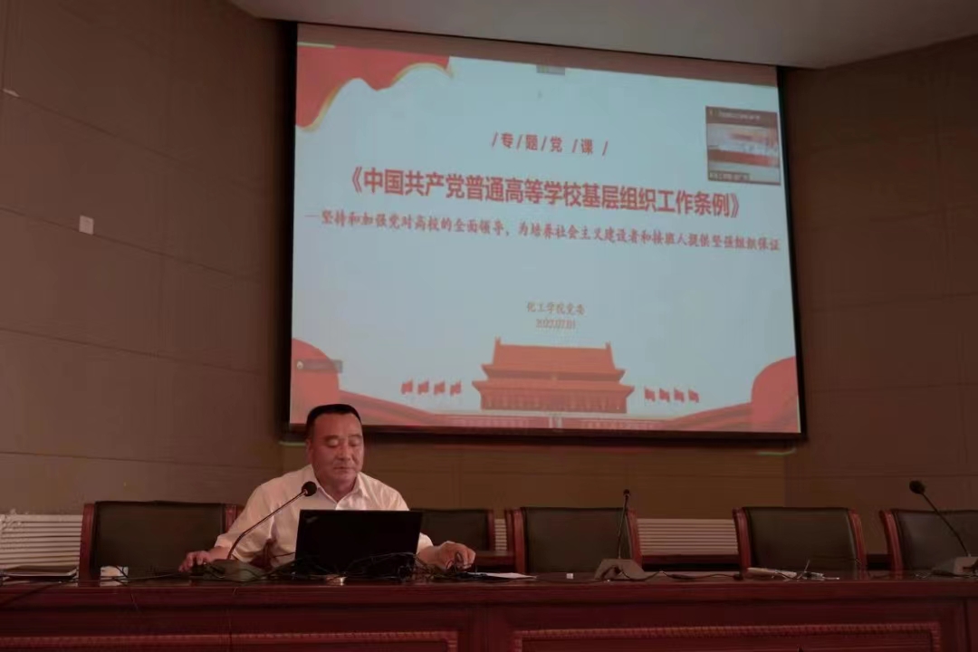 7月1日下午,化工学院党委在新城校区图书馆报告厅举办“庆七一·喜迎党的二十大”党员宣誓仪式暨党委书记讲专题党课活动。学院全体教师党员线下参加活动,117名学生党员及2022年春季学期新发展的88名预备党员线上参加活动。活动由院党委副书记、副院长张建主持。