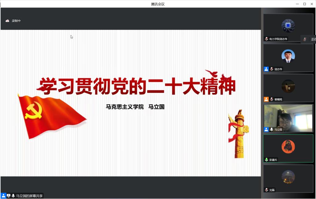 12月14日下午,电力学院党委邀请开云学习贯彻党的二十大精神师生宣讲团成员、马克思主义学院马立国教授作专题宣讲。学院党委书记彭建兵主持会议。领导班子成员、全体教师线上参加学习。