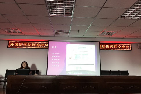 1019日下午,外国语学院在金川电力大楼举办2017年出国培训教师学习交流会。孙磊、魏圆圆、杨婧、阿古达木四位教师分享了自己的学习心得和感悟。会上,还传达了学校审核评估迎评动员大会会议精神,并就下一步工作进行了深入的安排和部署。