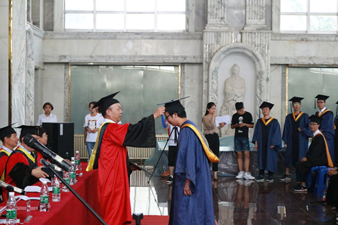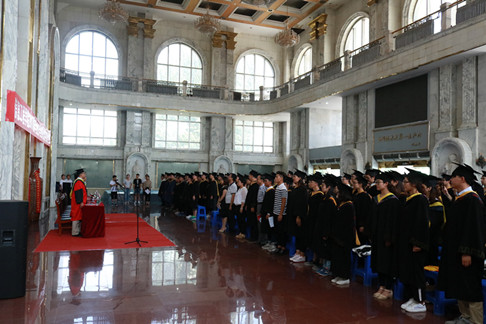 毕业典礼暨学位授予仪式在庄严的国歌声中拉开序幕。学位分委员会委员、副院长孟克其劳、刘利民分别宣读获得硕士学位毕业生名单、学士学位毕业生名单。受校长、校学位评定委员会主任委员邢永明教授的委托,学位分委员会主席、院长李春明为2017届获得硕士学位的毕业生授予学位,学院领导及学位分委员会成员为获得学士学位的毕业生授予学位。