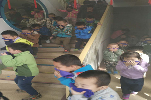幼儿园内东西楼道由烟雾器制造出浓浓的烟雾,班内响起警报声,各班教师迅速按照紧急疏散线路带领幼儿拿起湿毛巾,捂住口鼻,弯腰小步快走,迅速且井然有序的下楼,孩子们集中到操场安全地带,教师迅速地清点人数。疏散演练用时2分钟,演练活动紧张有序。