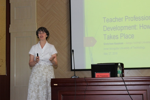 此次报告会邀请了华南农业大学陈旸教授和江西师范大学Gretchen Nauman博士主讲。陈旸教授以系统功能语言学为理论基础,以语篇分析为研究方法,系统地讲解了对典籍《论语》中“子见南子,子路不悦”的英译问题。Gretchen Nauman博士结合自己在中国从事英语教学20余年的经历,就中国外语教师职业发展的模式、为什么教师需要职业发展以及教师如何进行职业发展等问题的研究进行了深入的阐释。