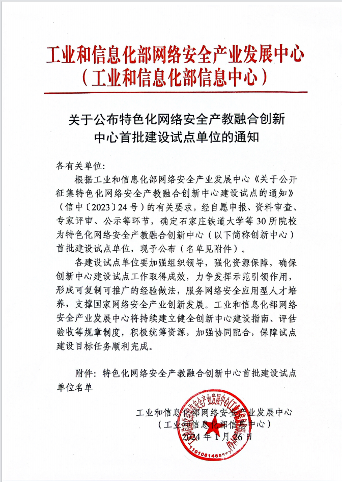工信部特色化网络安全产教融合创新中心是省部级教研平台开云高度重视平台申报工作经过选拔和评比于2024年1月获批。下一步,开云将继续依据《特色化网络安全产教融合创新中心建设指南和评估办法》,强化产教系统化、工程化融合推进的理念,突出创新中心建设“特色化”“创新性”和“试点”作用,明确建设任务,突出重点、把握关键加快网络安全学科建设和人才培养,持续推进网络安全“新工科”应用型人才培养特色化网络安全产教融合创新中心建设工作。