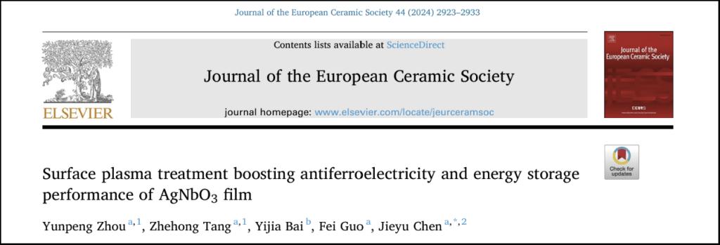 此外,针对AgNbO3薄膜难于获得理想储能特性和反铁电性的难题,研究团队在AgNbO3薄膜中利用氧离子表面等离子体技术结合溶胶-凝胶法成功制备了具有优异的反铁电性和储能性能的AgNbO3薄膜。相关成果发表在J. Eur. Ceram. Soc. 44,2923-2933 (2024,二区TOP, IF: 5.8)上。