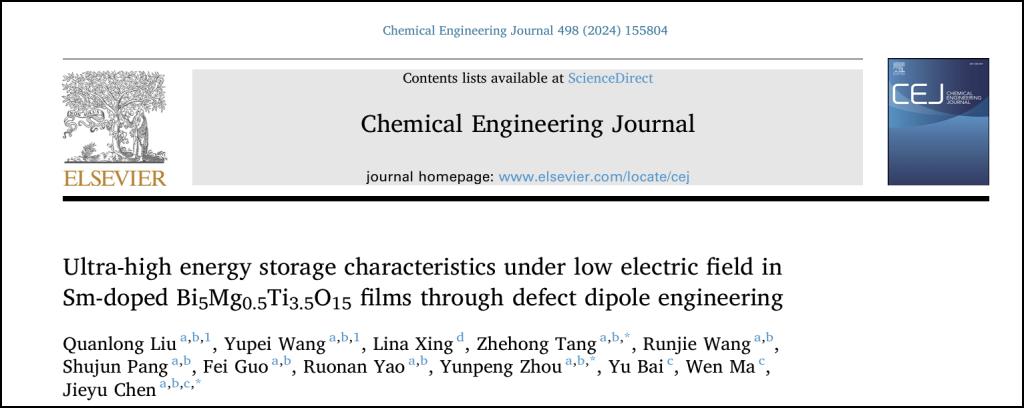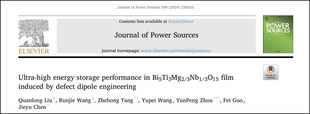 研究成果通过调控缺陷偶极驱动、畴驱动和绝缘性能,在介电储能薄膜领域取得了高可回收能量密度和优异能量效率,在一定范围内解决了极化强度、击穿电场和弛豫行为之间的钳制关系。相关成果发表在Chem. Eng. J. 498, 155804 (2024一区TOP, IF: 13.3) J. Power Sources 599,234210(2024,二区TOP, IF: 8.1)