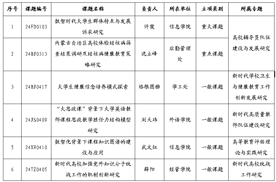 获批项目中,数智时代大学生群体特点与发展诉求研究入选高校辅导员队伍建设与发展研究类别重课题,内蒙古自治区高校体检结核病筛查结果调研及结核病健康教育策略研究入选高校辅导员队伍建设与发展研究类别重点课题。
