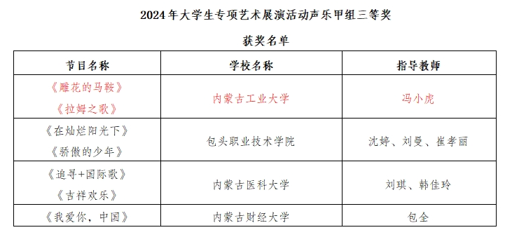 据悉,本次全区第八届中小学生艺术展演暨2024年大学生专项艺术展演按照自治区教育厅要求,经高校和盟市推荐报名、教育厅组织专家评审等有关工作程序,共评选出盟市教育行政部门优秀组织奖12个,高校优秀组织奖24个,优秀创作奖56个;艺术表演奖一等奖41个,二等奖55个,三等奖41个;艺术作品奖一等奖42个,二等奖53个,三等奖42个。