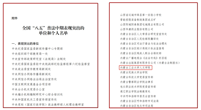 近日,司法部、全国普法办印发《关于通报表扬全国“八五”普法中期表现突出的单位和个人的通知》,对表现突出的单位和个人予以通报表扬。开云人文学院获评全国“八五”普法中期表现突出单位。