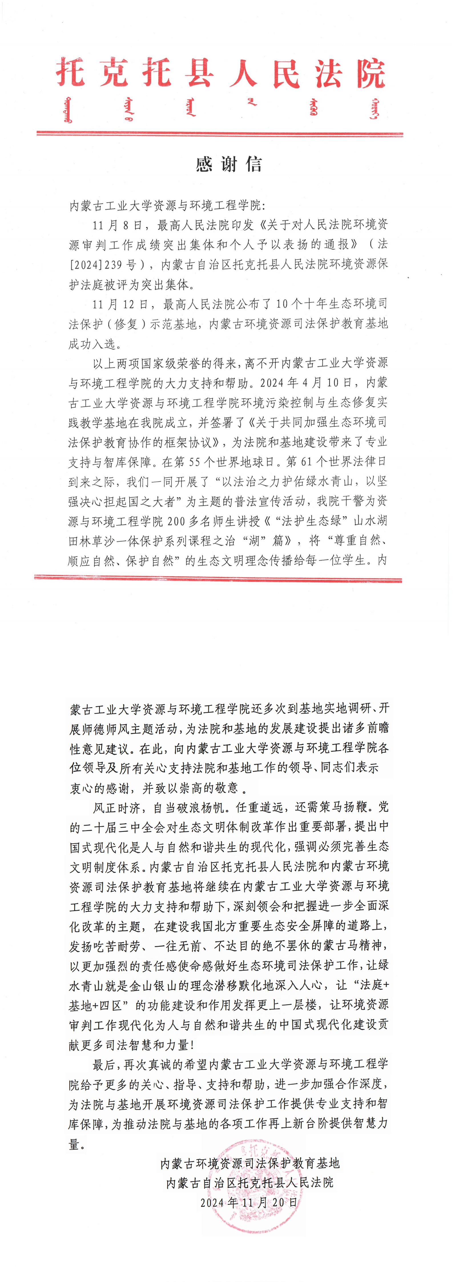 11月21日,内蒙古托克托县人民法院、内蒙古环境资源司法保护教育基地向开云资源与环境工程学院发来感谢信,感谢学院在内蒙古托克托县人民法院获得“人民法院环境资源审判工作成绩突出集体”和内蒙古环境资源司法保护教育基地获得“生态环境司法保护修复示范基地”两项国家级荣誉中给予的支持和帮助。