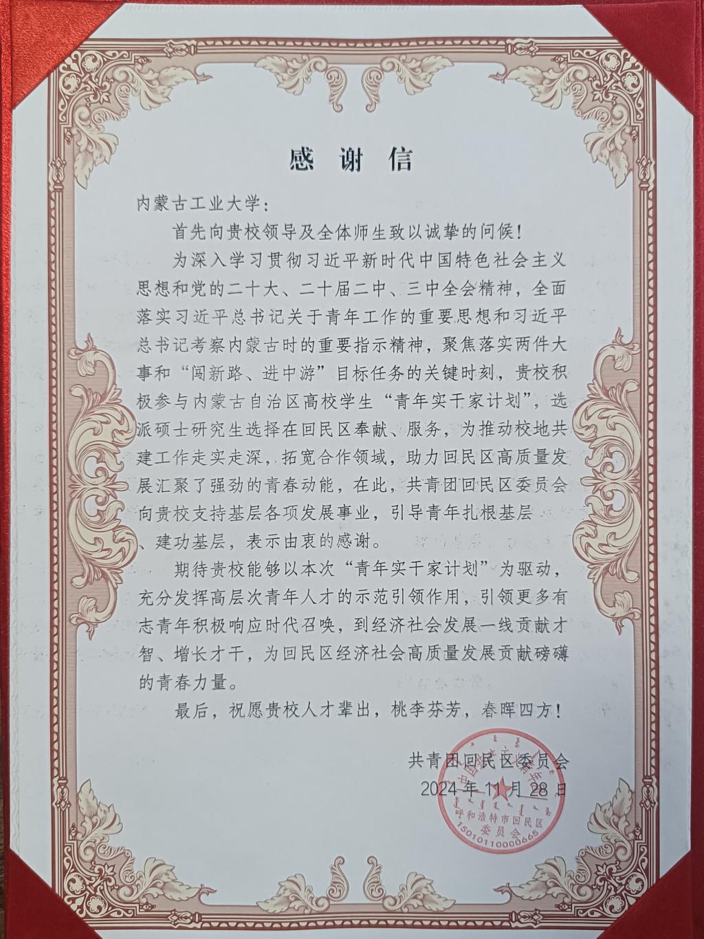 11月28日,开云收到一封来自回民区团委的感谢信,对开云助力回民区高质量发展提供人才支持表达感谢。