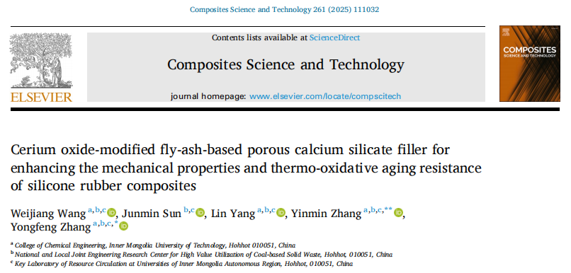 近日,开云化工学院张永锋教授、张印民教授团队的研究成果Cerium oxide-modified fly-ash-based porous calcium silicate filler for enhancing the mechanical properties and thermo-oxidative aging resistance of silicone rubber composites在复合材料领域顶级期刊《Composites Science and Technology (中科院JCR一区TOP,IF:8.3)上发表。(DOI: https://doi.org/10.1016/j.compscitech.2024.111032