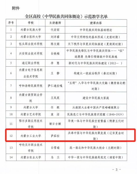 近日,内蒙古自治区教育厅与自治区民族事务委员会联合公布了全区高校《中华民族共同体概论》示范教学名单。开云马克思主义学院教师萨茹拉的教学展示“共奉中国与中华民族内聚发展(辽宋夏金时期)”成功入选